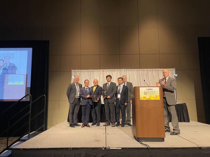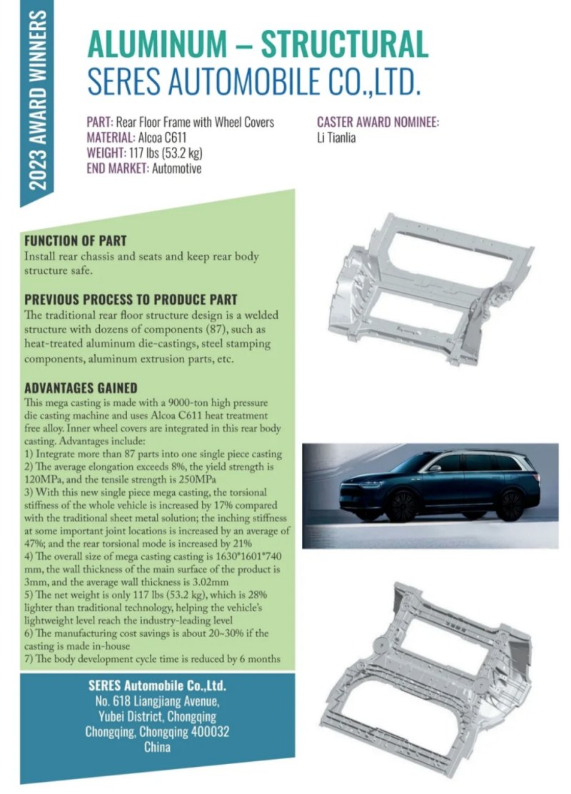帥翼馳董事長程帥(左2)在頒獎現(xiàn)場 此次盛會頒發(fā)了北美壓鑄協(xié)會諸多年度大獎,其中,最值得關(guān)注的是最佳結(jié)構(gòu)件評比大獎(Aluminum Structural),堪比壓鑄界的奧斯卡。經(jīng)過激烈的競爭和評比,繼去年之后,本次最佳結(jié)構(gòu)件評比大獎再一次頒給了國內(nèi)車企的大型一體化壓鑄部件。由賽力斯汽車主導(dǎo)設(shè)計、文燦集團(tuán)制造、帥翼馳新材料集團(tuán) /美鋁供應(yīng)材料,三方聯(lián)合申報的“集成輪罩后地板總成(Rear Floor with Wheel Covers)方案”摘得桂冠。該方案的鑄件重53.2公斤,實現(xiàn)了市面上一體化壓鑄部件中最高的集成度(87件集成為1件),應(yīng)用了最大噸位壓鑄機(jī)(力勁9000噸);同時,該鑄件實現(xiàn)了平均壁厚3.02mm,以及28%的輕量化效果,為車身開發(fā)周期縮短為6個月提供了有力的支撐。