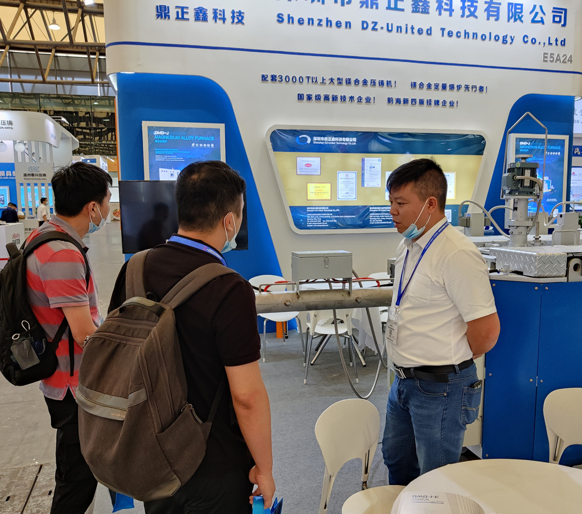 鼎正鑫技術(shù)人員為專業(yè)觀眾講解 為保證熔爐的安全性,提高熔爐的穩(wěn)定性能,適應(yīng)新型鎂合金材料的應(yīng)用條件,新型鎂合金熔爐可通過互聯(lián)網(wǎng)實現(xiàn)生產(chǎn)自動化信息交換及遠(yuǎn)程監(jiān)控,控制上采用全閉環(huán)控制系統(tǒng),保證設(shè)備的安全,硬件上針對新材料的特性進行系統(tǒng)改造和優(yōu)化升級,針對環(huán)保要求開發(fā)的新型保護氣體的應(yīng)用,徹底解決保護氣體SF6的溫習(xí)效應(yīng)問題。結(jié)構(gòu)上采用環(huán)保可回收材料,實現(xiàn)綠色生產(chǎn)。 為順應(yīng)“一體壓鑄”的趨勢,我司推出了DMD-E-E及DMD-G-E組合爐系列熔爐,采用一個熔化或者多個熔化爐加保溫爐的結(jié)構(gòu),爐與爐之間采用虹吸管聯(lián)接,專為大型鎂合金壓鑄件設(shè)計,滿足大型壓鑄件壓鑄需求,提高鎂液純凈度及溫控精度的要求,提高產(chǎn)品的良品率,目前成功應(yīng)用3000T~4500T鎂合金壓鑄多臺。