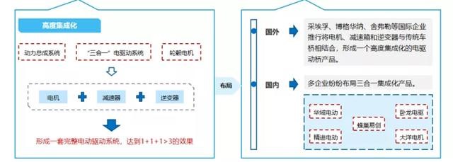 數據來源:根據公開信息整理 我國新能源汽車驅動電機技術方向 目前,多企業正積極推動產品升級、追求發展“三合一”集成產品即產品向輕量化、小型化、低成本化方向邁進。隨著新能源汽車的大批量投產,動力系統出現了高度集成化、電機永磁同步化、高功率密度化、減速系統多擋化、冷卻系統多樣化的趨勢。