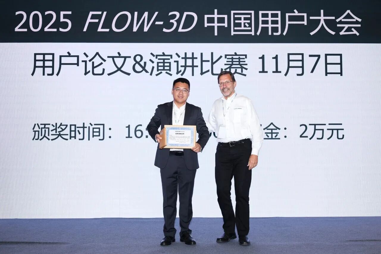 諾瑪科(Nemak)中國區產品中心研發經理朱仁舉先生 本屆大會特別邀請龐璽偉先生與朱仁舉先生擔任評審嘉賓,為用戶論文及演講比賽提供專業評審意見。大會現場,FLOW-3D 美國總部(Flow Science公司)副總裁 Thomas S. Jensen 先生親自為獲獎者頒發榮譽證書及2萬元獎金,以表彰其在技術創新與應用實踐方面取得的杰出成果。