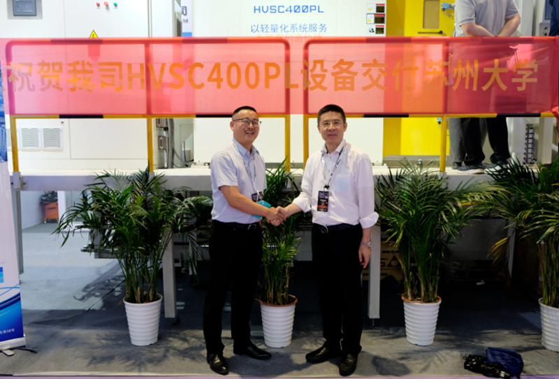 蘇州大學張海教授與廣州和德石洪偉總經理 隨后,廣州和德總經理石洪偉向雙方達成的戰略合作表示感謝。他表示,和德將第三代HVSC400PL型擠壓鑄造裝備交付給蘇州大學,雙方將在基于擠壓鑄造成型工藝專用材料研發,80-120MPa機械靜壓力下凝固過程中溫度、壓力對產品力學性能的影響等基礎理論方面進行研究,最終形成基于此工藝的底層數據及邏輯框架,廣泛服務于擠壓鑄造行業。 儀式最后,在與會領導和行業同仁的見證下,校企雙方領導共同簽訂了戰略合作協議,并合影留念。